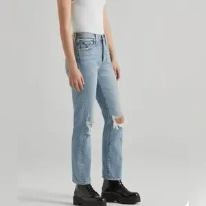 The CAl is a high-rise women's jean with a classic straight leg. It sits at the natural waist and its relaxed silhouette is universally flattering. In a light vintage indigo wash with worn-in whiskering and holes.
