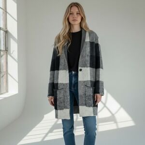 American Eagle Buffalo Plaid Longline Cardigan Sweater Black Grey White L/XL