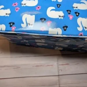 Vibrant blue pouch with whimsical cat and flower design. Features a zip closure and convenient handle.