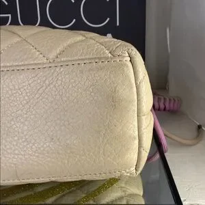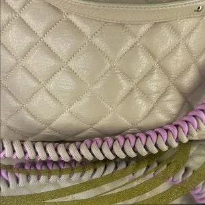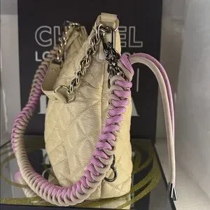 Chic quilted beige design. Accented with a pink strap. Ideal for versatile style. Comes with an artisan Colorado handmade braided shoulder strap. There is some wear signs and look at pics and ask questions for further transparency