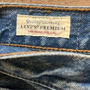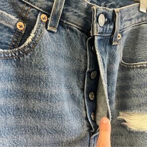 Levi's Premium Denim Jean Button Fly Midi Skirt Raw Hem Distressed Size 26 Slit