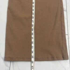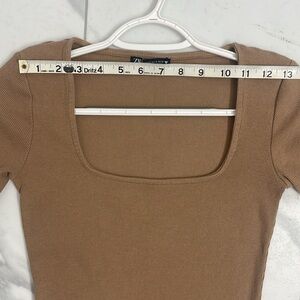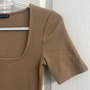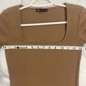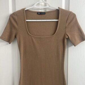 Zara Midi Bodycon Dress Ribbed Square Neck Short Sleeves Tan Size S