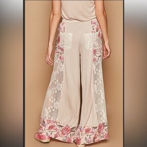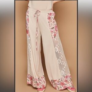 Elegant wide-leg pants with floral lace detail. Features a pink and cream color scheme. Comfortable and stylish for any occasion.