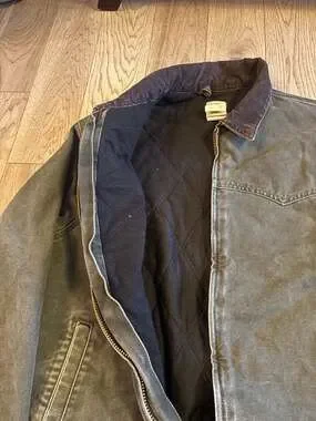 Vintage Carhartt J14 MOS Santa Fe Bomber Jacket in Moss Green, Size XL Tall (fits XL/L) This rugged workwear staple features a durable sandstone duck cotton shell with a quilted flannel lining for warmth. The design includes a corduroy-trimmed collar, western-style front and back yokes, and rib-knit cuffs and waistband for a classic bomber silhouette. Heavily distressed vintage condition with significant fading and wear throughout, providing a sought-after authentic workwear aesthetic. Perfect for street style or heavy-duty use.