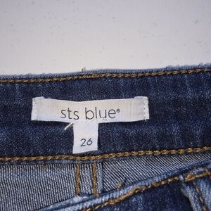 STS Blue Women's Size 26, Medium Wash, Stretch. Raw Fray Hem, Classic 5 Pocket Design, Relaxed fit for all-day comfort. High rise, Button and zipper closure, Perfect for everyday wear.