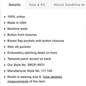 Size small is roomie and looser cut with three-quarter length button sleeves.