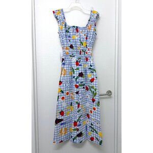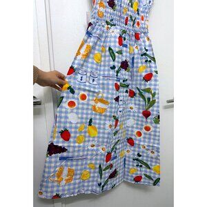 This Lisa Says Gah Annie Picnic Alfresco Print Dress is brand new with tags (NWT)! Features a food / vegetable / veggie / fruit (lemon) print on a blue and white gingham check background. Cotton, long midi maxi length, sleeveless, square neck, ruffle detailing, smocked at the waist.