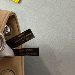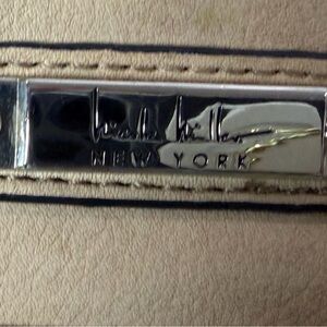 Elegant Nicole Miller shoulder bag in tan. Features chain and leather straps. Front zip pocket for convenience. Outside is mostly good, inside has ink stains. Structurally it is in good shape