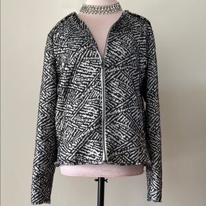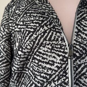 Stylish Tribal jacket with a bold black and white pattern. Features a zip-up front and long sleeves. Perfect for layering.