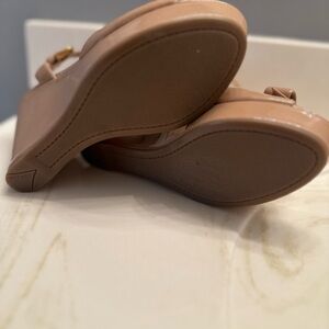 Elevate your summer or event wardrobe with these gorgeous, authentic Prada wedges. Crafted in Italy from high-shine "Vernice" (patent) leather in the sought-after "Nudo" shade, these shoes offer a perfect blend of elegance and comfort.