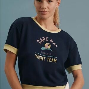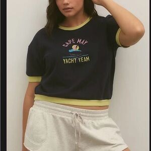 Stylish crop top with 'Cape May Yacht Team' graphic. Navy body with yellow trim. Perfect for casual outings.