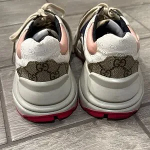 Elegant Gucci sneakers featuring pink and blue tones. Stylish and comfortable for everyday wear.