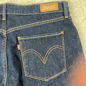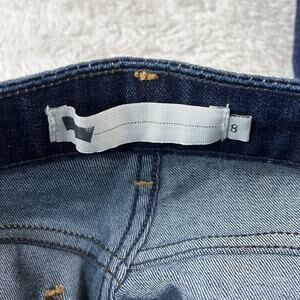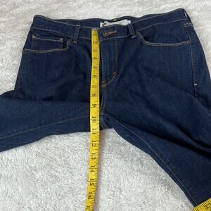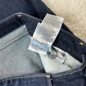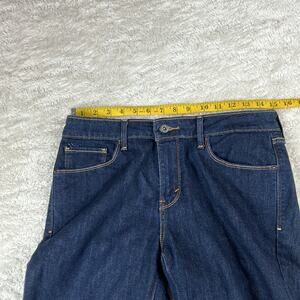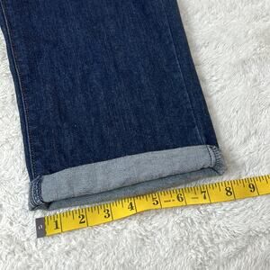 Dark wash denim with cuffed hems, traditional 5 pocket cut, and zip and button closure. Mid to high rise waist, with not much for stretch.