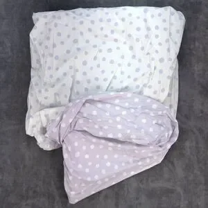 Pottery Barn Kids twin size duvet cover in a soft lavender and white polka dot print. Reversible design features white with lavender dots on one side and lavender with white dots on the other—perfect for refreshing a child’s bedroom with a sweet, classic look.