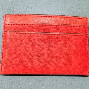 Bold Coral colored card case by Coach. Features a textured design with gold logo. Slight rubbing to logo.