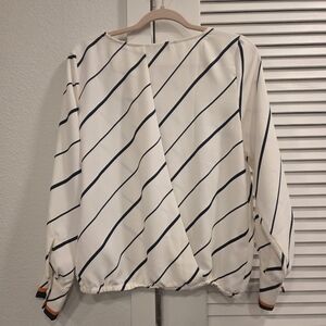 Woven long-sleeve blouse with a bubble hem and buttoned shoulder detail. Features navy diagonal stripes on a crisp white background, finished with an orange and navy contrast border at the cuffs for a bold pop of color.