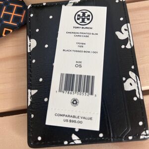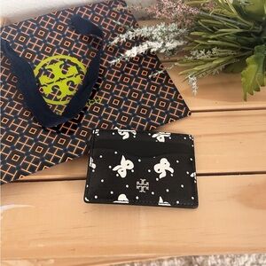 NWT🎀Tory Burch Emerson Printed Slim Card Case/Holder Black Tossed Bow Silver