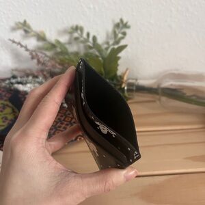 Stylish black card holder with white bow pattern. Perfect for organizing cards.