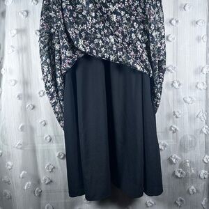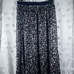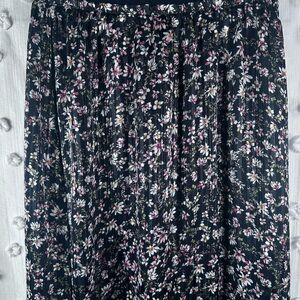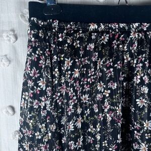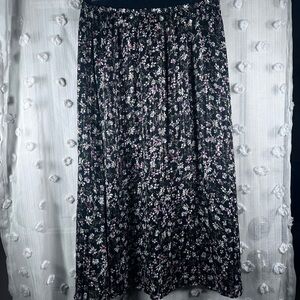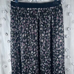 Beautiful black midi skirt with whimsical floral pattern. Features a velvet waistband, sheer overlay, full lining for comfort, and unique shimmery threading. Perfect for any occasion. Great pre-owned condition with some pulls. Women’s size small.