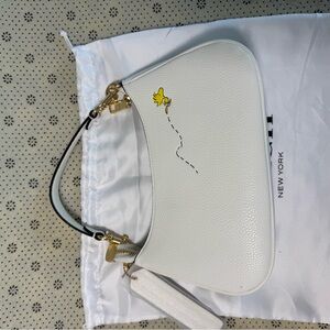 Stylish Coach shoulder bag with Snoopy and Woodstock design. Elegant white leather with gold accents. Perfect for casual outings.