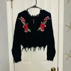 NWT ZAFUL Black cropped crochet sweater with rose patch detailing. One size but fits up to a large.