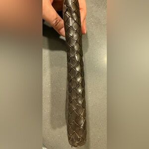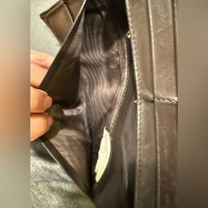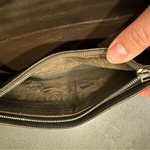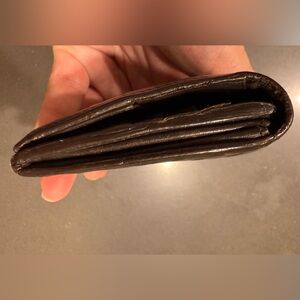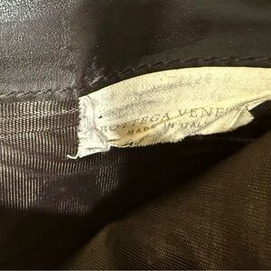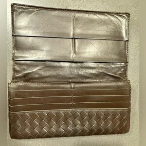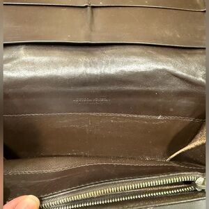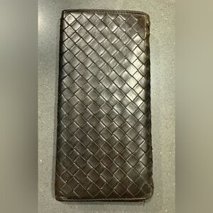 Beautiful woven Intrecciato leather clutch in a rich brownish black color. There’s some rubbing to corners. Cracking to bottom. Inside there’s peeling in coin pocket.