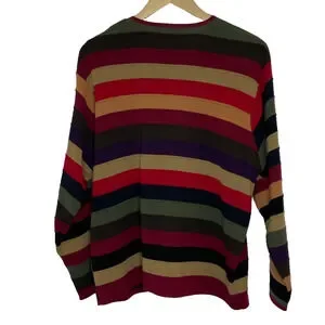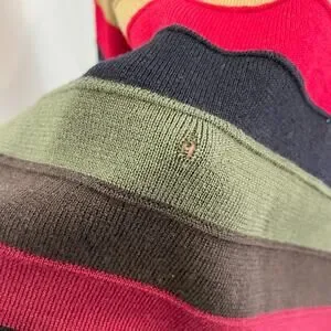 This Women's Large Vintage Bleyle 100% Extrafine Merino Wool Colorful Stripe Cardigan is a stylish and cozy sweater perfect for the fall and winter seasons. Made of high-quality wool and featuring long sleeves, this knit cardigan in a vibrant multicolor stripe pattern is a versatile piece that can be worn casually. The vintage brand adds a unique touch to this classic cardigan, making it a standout addition to any woman's wardrobe. Note one small hole in the back.