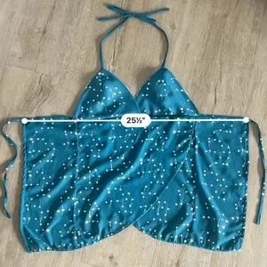 A dreamy, one-of-a-kind Y2K fairy mermaid top, handmade from a vintage embellished fabric + Deep teal blue with shimmering silver sequin constellations throughout. The criss-cross front and asymmetric hemline add the perfect ethereal touch. Ultra-flowy and lightweight for that effortless goddess vibe!