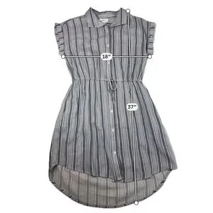 •Features: stripes, pockets, ties at waist, chest pockets, hit just above the knees, collar, shirt dress