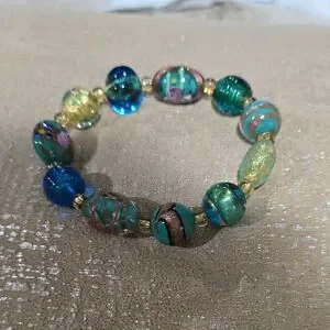 Elegant Green and Gold Beaded Bracelet. Murano. One Of A Kind. Hand Painted.