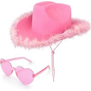 Features: Bright pink felt cowboy hat with a fluffy feather boa trim on the brim, making it super eye-catching and playful. Includes a pair of heart-shaped pink sunglasses that add a cute, romantic vibe. Lightweight, durable materials with an adjustable drawstring for a comfy fit.