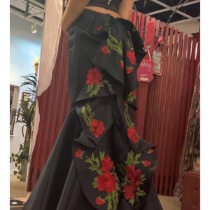 Elegant black gown adorned with striking red floral designs. Perfect for prom or special occasions.
