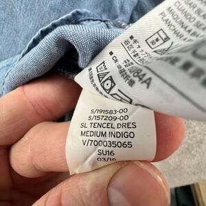 Sleeveless Tencel lyocell shift dress in a light wash denim look. This casual piece features a split V-neckline with a single-button henley placket and a curved high-low hem for a relaxed silhouette. Crafted from soft, breathable Tencel, it offers a lightweight feel perfect for warm weather or layering. Note a small faint spot on the lower back as pictured.