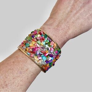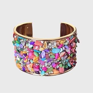 Elevate your style with this exquisite wide gold cuff bracelet, adorned with a vibrant mix of gemstones and it’s adjustable. Perfect for adding a touch of elegance to any ensemble.