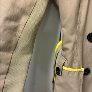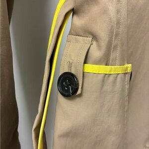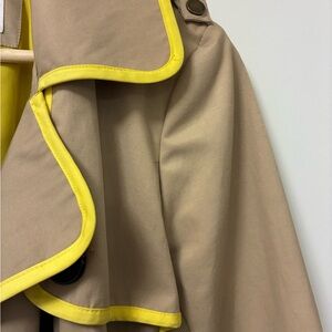 Stylish tan trench coat with bold yellow trim. Perfect for a modern, chic look.