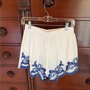 Stylish white shorts with elegant blue embroidery. Perfect for casual outings. Comfortable and chic design.