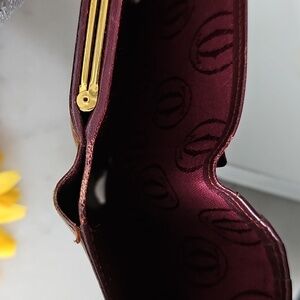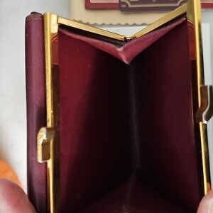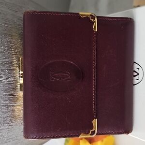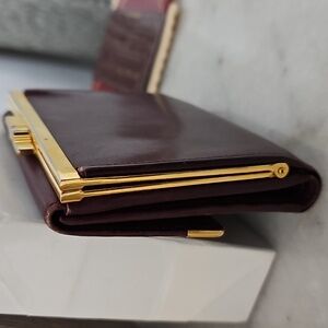 Full Inclusion, Burgundy Leather Cartier Kisslock Wallet with gold-tone hardware. Elegant wallet with sleek leather that is iconic for the Cartier brand. Minimal wear on corners (see photos).