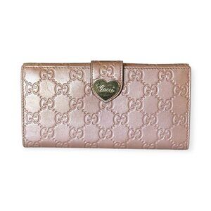 A chic and feminine Gucci continental wallet crafted in signature Guccissima embossed leather with a soft metallic rose gold finish. This piece features the iconic interlocking GG pattern throughout and is accented with a gold-tone heart-shaped snap closure engraved with the Gucci logo.