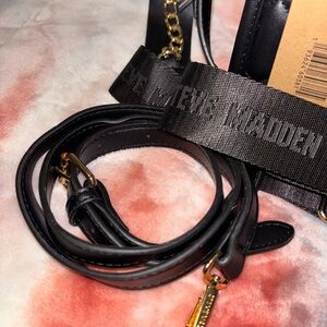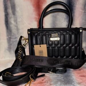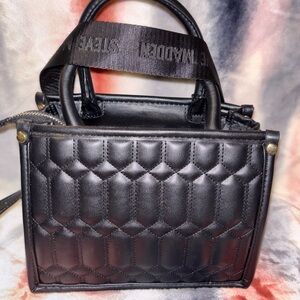 Chic black quilted design. Features adjustable strap. Stylish and versatile.