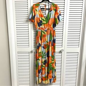 The NWT Abel the Label Anthropologie Hilda Floral Maxi Dress is a vibrant and versatile piece perfect for various occasions. This long dress features a smocked waist and flutter sleeves, offering a relaxed and comfortable fit. The colorful floral pattern and V-neckline add a touch of nature-inspired charm, making it a great choice for summer and spring events like weddings, parties, or casual outings. Made from lightweight rayon fabric, this dress is easy to care for with machine washable instructions, ensuring convenience for the busy fashion-forward woman looking to make a statement.