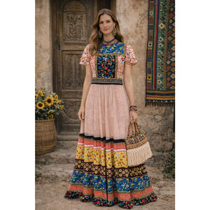 Vicky and Lucas Boho Multicolor Maxi Tiered Dress Size S Prairie Artsy Eclectic