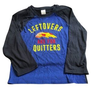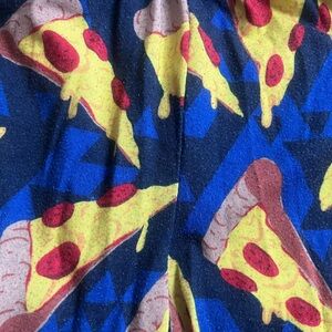 Fun pizza print pajama set. Blue long-sleeve top with playful text. Comfortable yellow and blue pants.