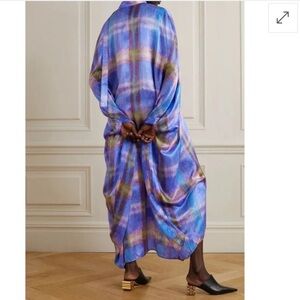 Gorgeous Thebe Magugu's maxi Kaftan dress is crafted from lustrous silk-satin with a checked pattern. It has a loose silhouette, Neck ties, a detachable waist tie, and is designed to slip on. The dress is made of a lightweight, non-stretchy fabric. It features an exaggerated silhouette that can be styled with bold accessories, such as oversized earrings and sculptural mules.