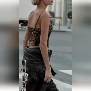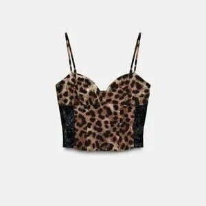 Stylish leopard print cami top with lace details. Perfect for a chic look.