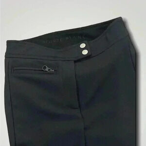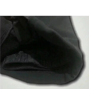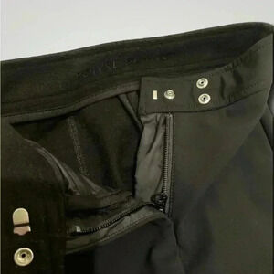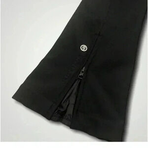 Black soft shell pants with zippered front & back pockets- zippers up back leg with logo. Inside snow gaiters. Seat has slight rub as seen on close up