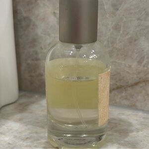 Clear bottle with beige label. Minimalist design. Sophisticated fragrance.