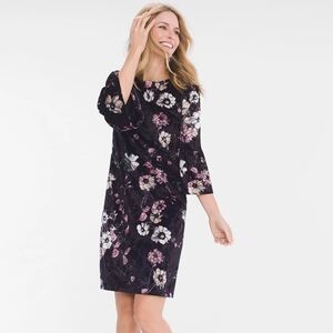 Chico's Black Floral Velvet Bell Sleeves Midi Shift Dress Size 3 (US 16/18)