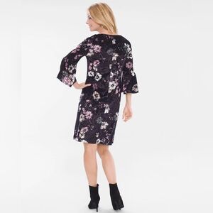 This is a pretty black velvet floral dress from Chico's. Fun half bell sleeves. Body is lined. Fabric is stretchy. No zipper.