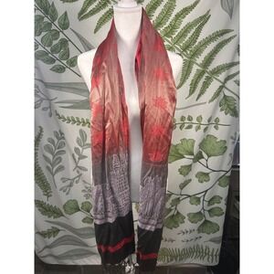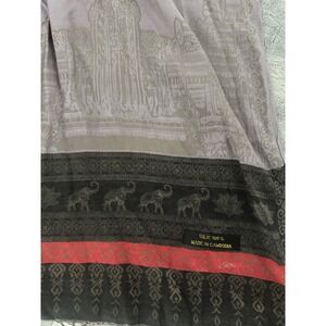 100% Silk Scarf Red Grey Ombre Angkor Wat Temple Lotus Elephant Print Cambodia