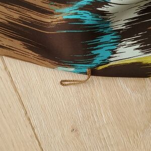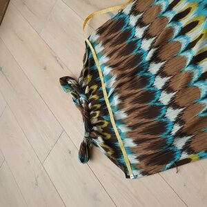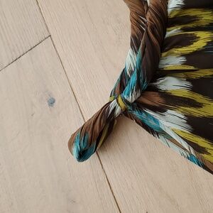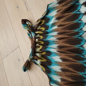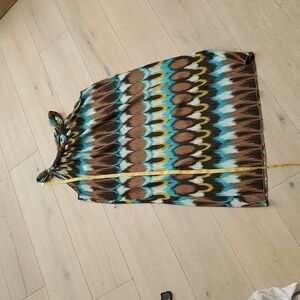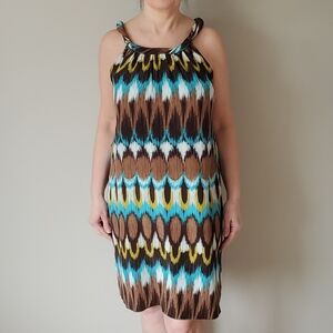 Stylish sleeveless dress with a vibrant multicolor pattern. Features shades of brown, blue, and yellow.